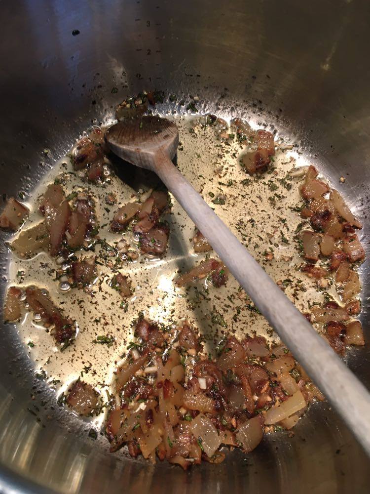 Dans la même marmite, sans ajouter de la matière grasse, faire revenir l’oignon et l’ail en ajoutant le cas échéant un filet d’eau. Saler et poivrer. Bien détacher les sucs de cuisson du lard avec une cuillère en bois et laisser suer à petit feu à couvert pendant quelques minutes, tout en surveillant bien et en mélangeant souvent.