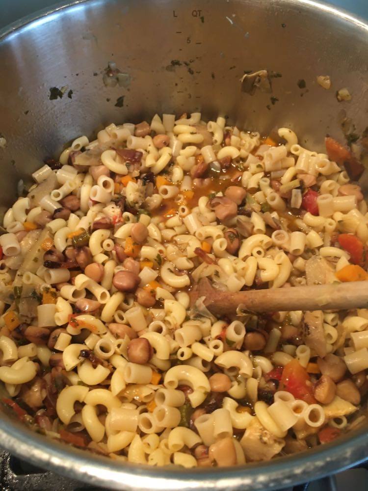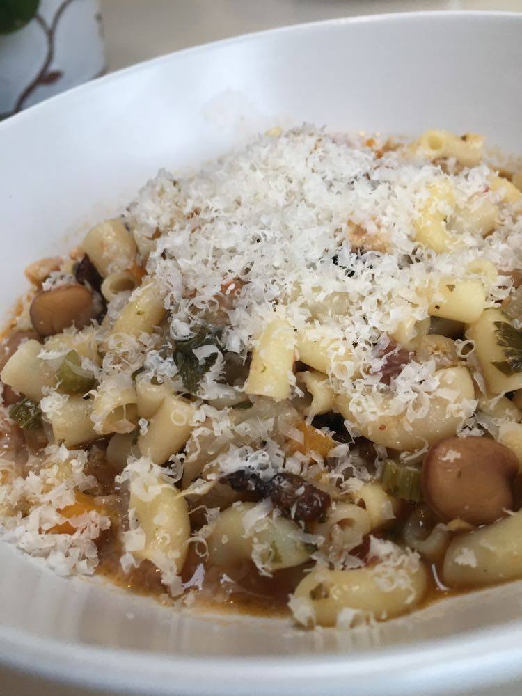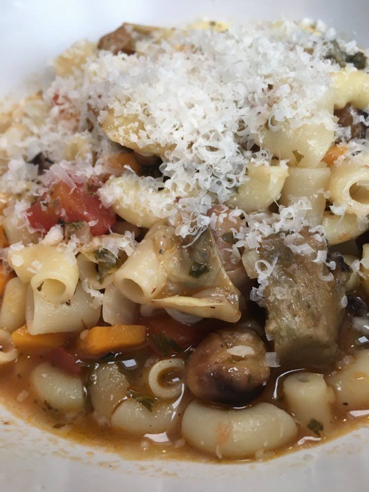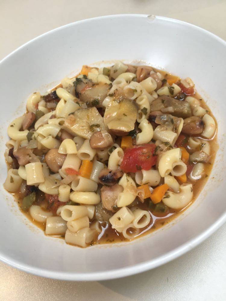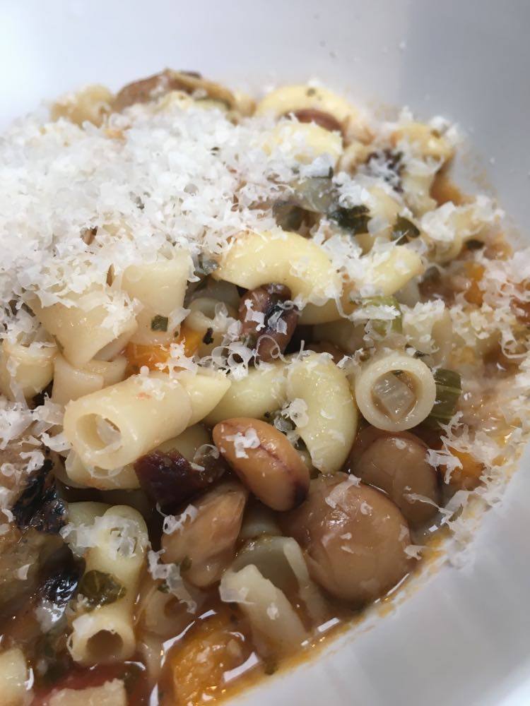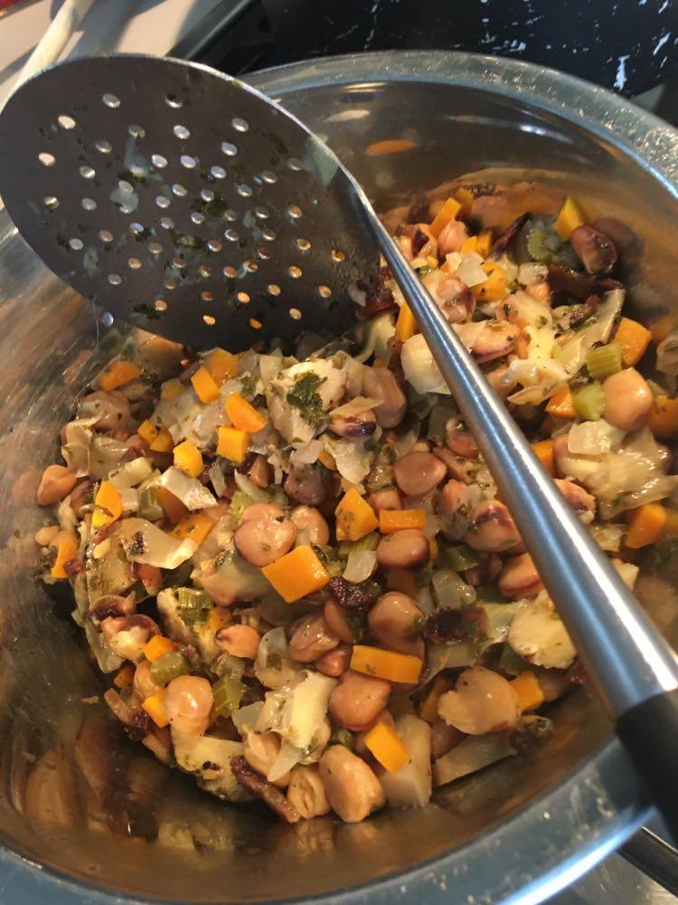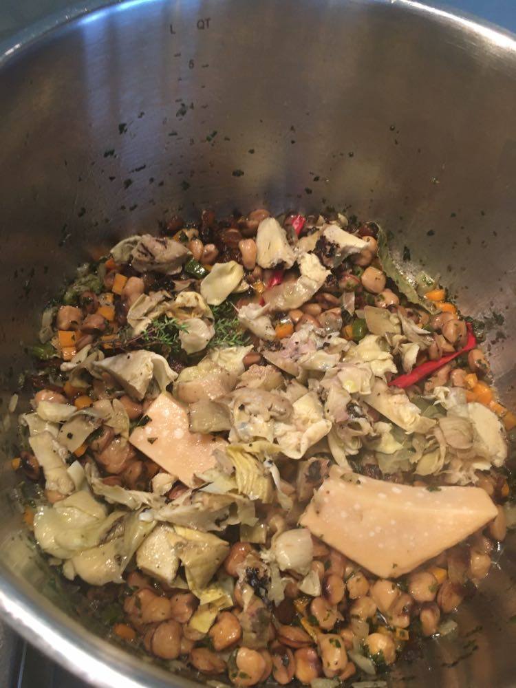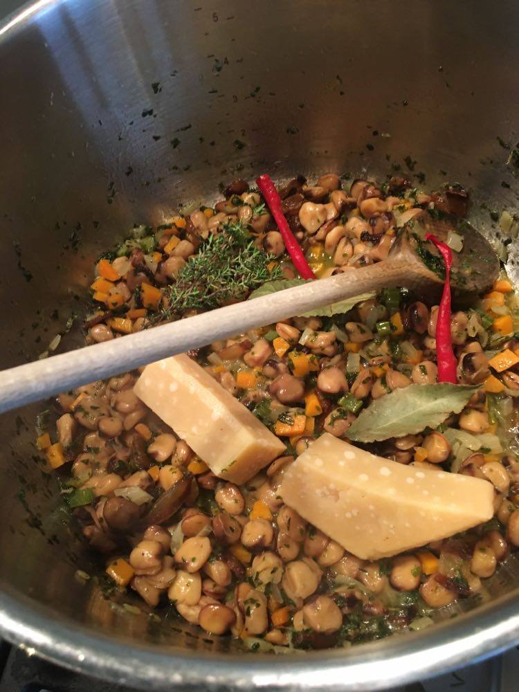 Le goût de cette légumineuse se rapproche du pois chiche, en plus fin. J’ai décidé d’en faire mon ingrédient principal pour un potage bien consistant d’inspiration très traditionnelle de la cuisine italienne ‘povera’, rappelant les pasta e fagioli. J’y ai joint l’artichaut.
