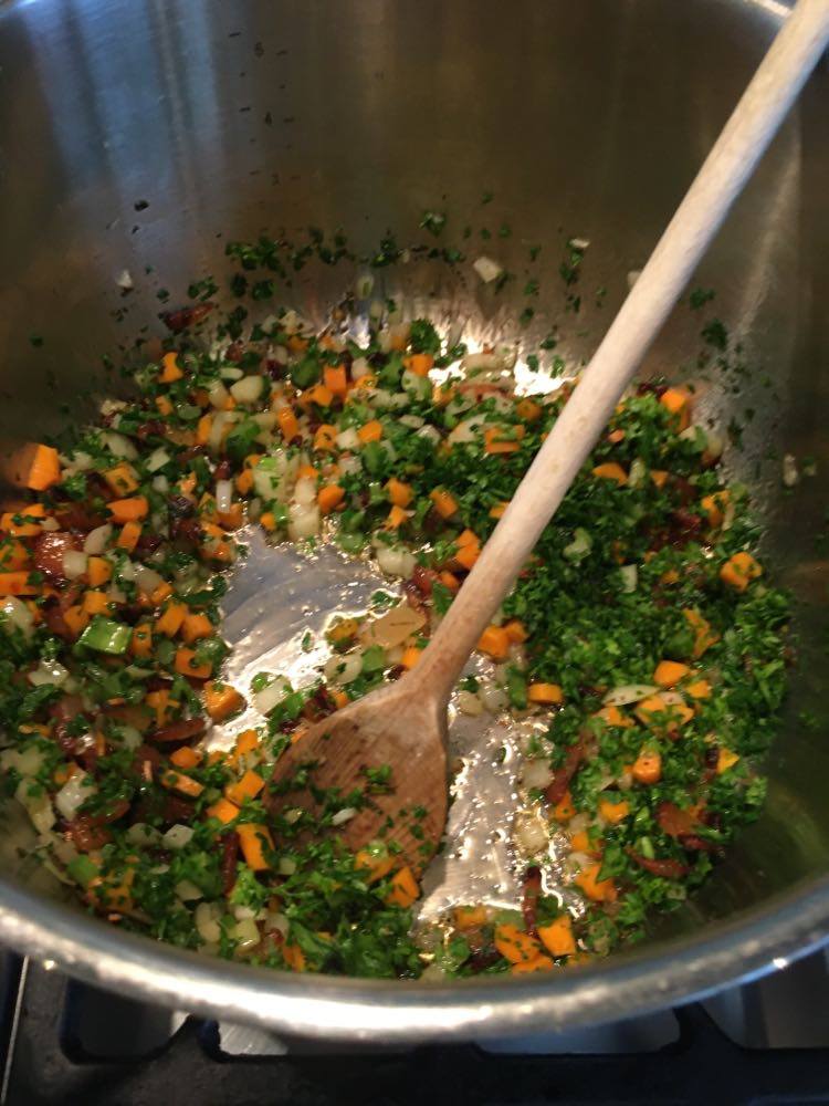 Faire chauffer un peu d’huile d’olive (ou récupérez celle des artichauts) dans une grande sauteuse et y faire dorer l’ail avec le romarin et le guaciale pendant quelques minutes, puis ajouter l’oignon, la carotte et le céleri, ainsi que le piment et le persil et faire revenir à feux doux pendant environ dix minutes. Saler et poivrer.