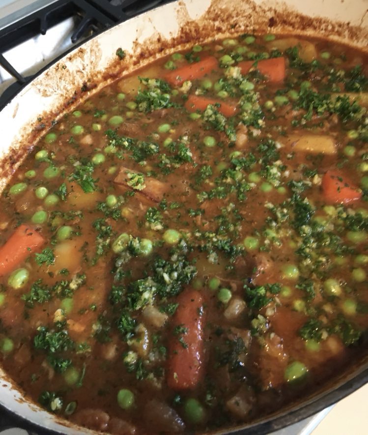 Avant je cuisinais ces quantités dans une très grande (large) cocotte style Le Creuset, mais elle a rendue l’âme. Depuis je la cuisine dans un römertopf alsacien et ça fonctionne très bien. Le seul hic est que généralement je n’arrive pas à mettre tout le liquide (cidre, bouillon, vin). Mais comme nous en mangeons et le jour même et qu’on portionne le reste, on peut encore, si nécessaire, ajouter un peu de liquide (en tenant compte du fait qu’on le réchauffera. Par contre, pour la précuisson des oignons et des viandes, j’utilise une cocotte de taille moyenne. L’idéal est la toute grande cocotte naturellement.