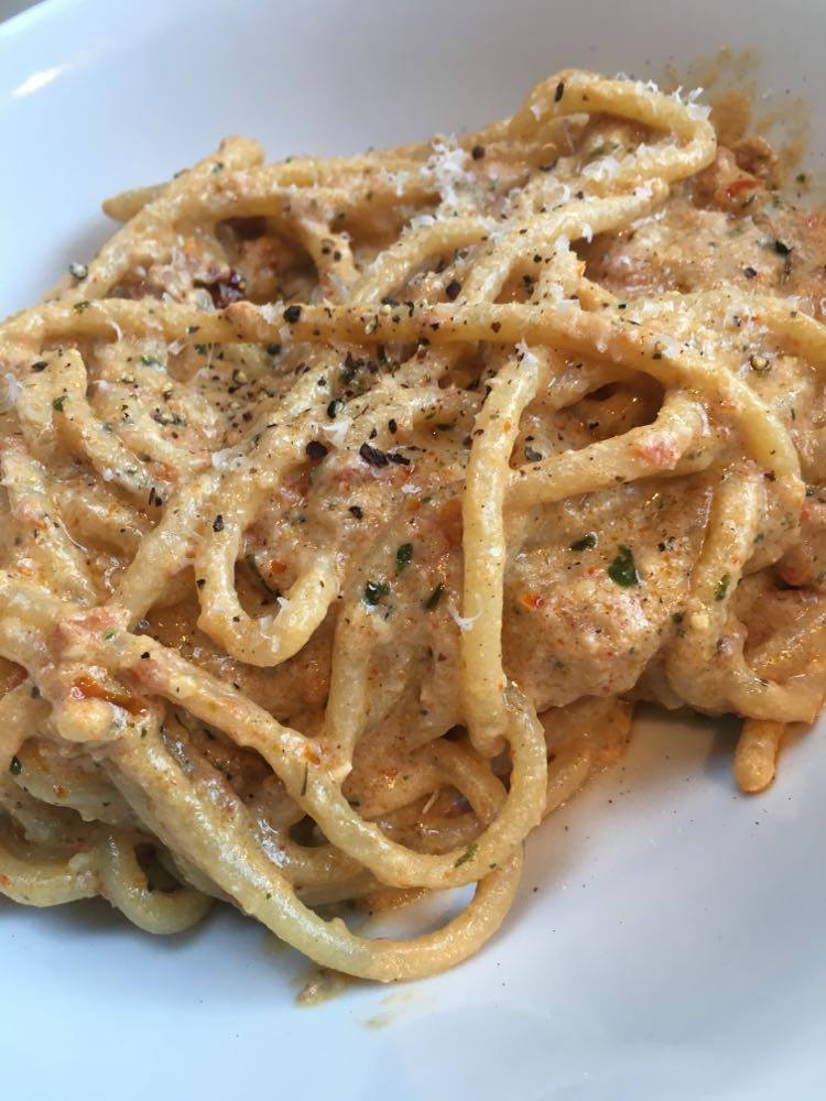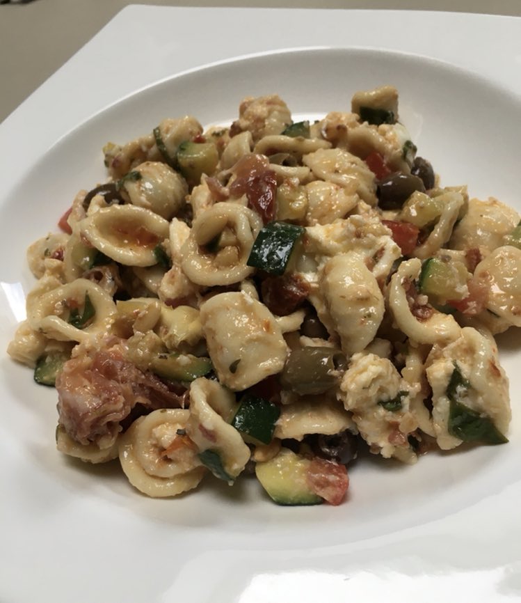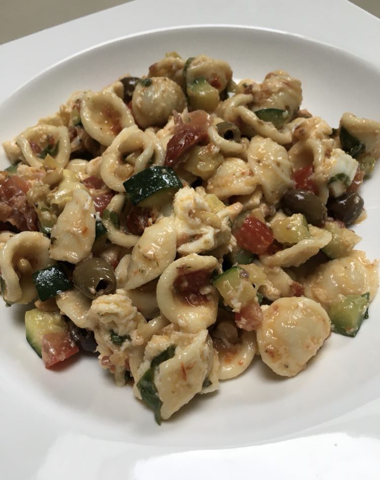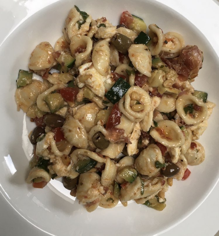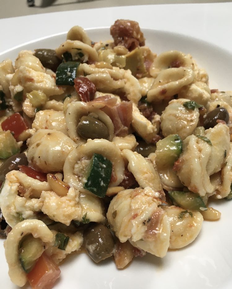 Pour ce soir j’ai eu envie de préparer une salade composée de produits typiques italiens avec comme base des orecchiette, un pesto de tomates séchées diablement bon et de la bonne mozzarella de bufflone. Ensuite on ajoute courgette sautée, tomates fraîches et séchées, olives taggiasche, artichauts à l’huile, pignons de pin et amandes blanches, jambon de Parme, origan et une vinaigrette huile d’olive-citron-basilic.