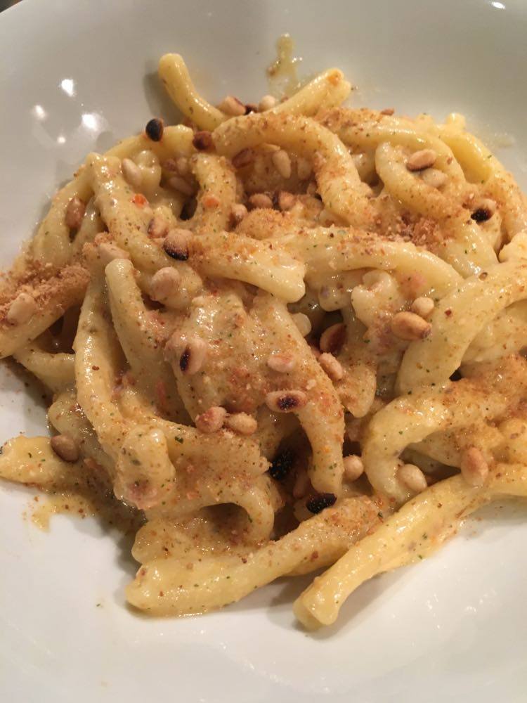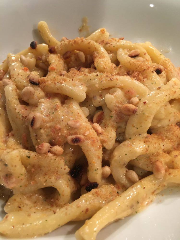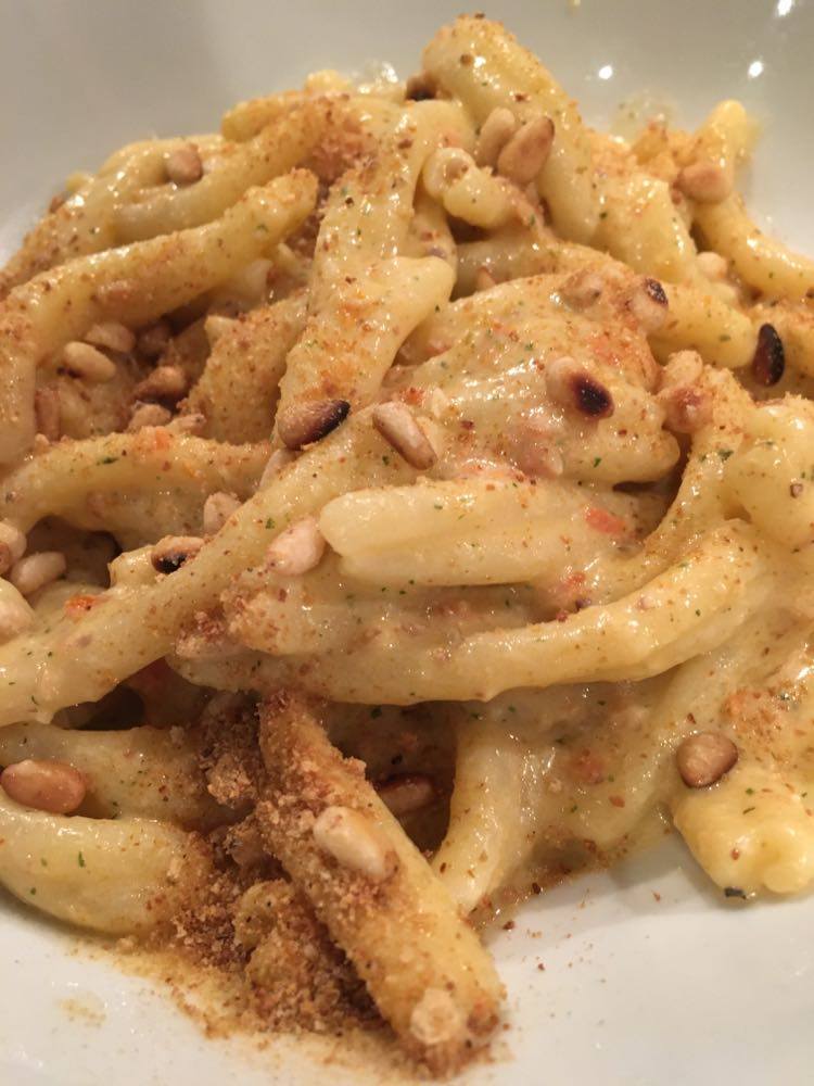 Faire torréfier les pignons à sec et les laisser refroidir. Faire de même avec les amandes. Hacher grossièrement les amandes. Ajouter les deux aux pâtes, puis mélanger.