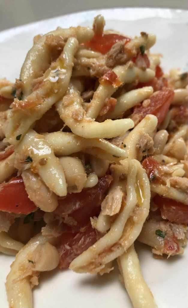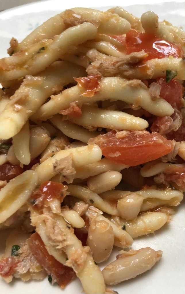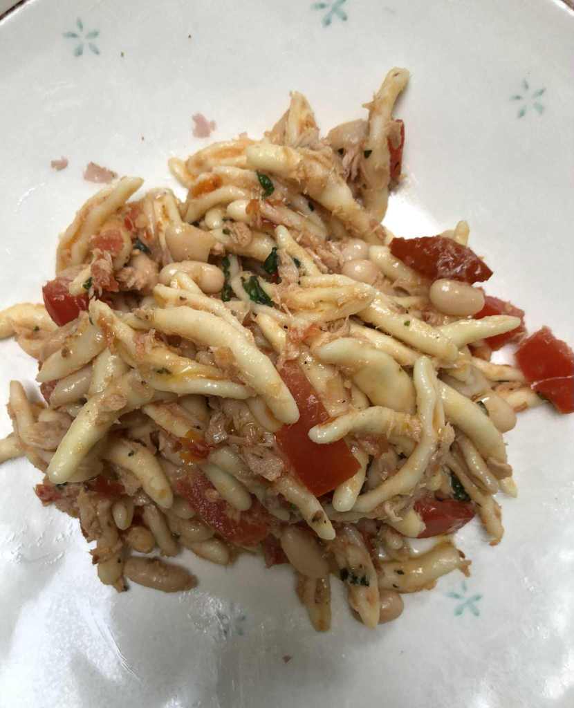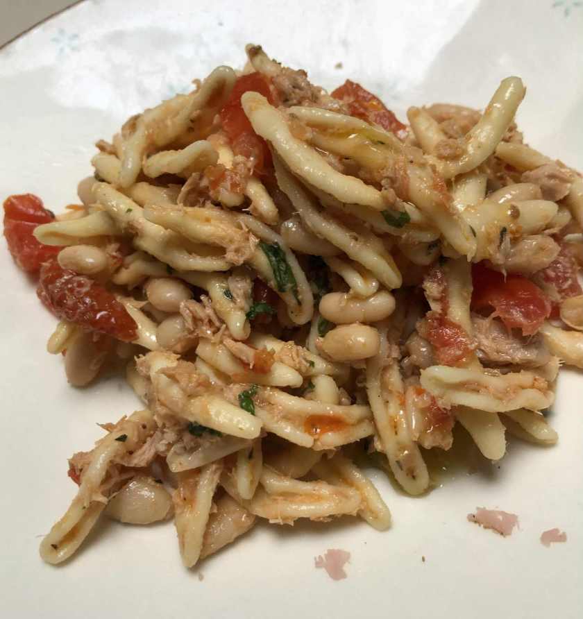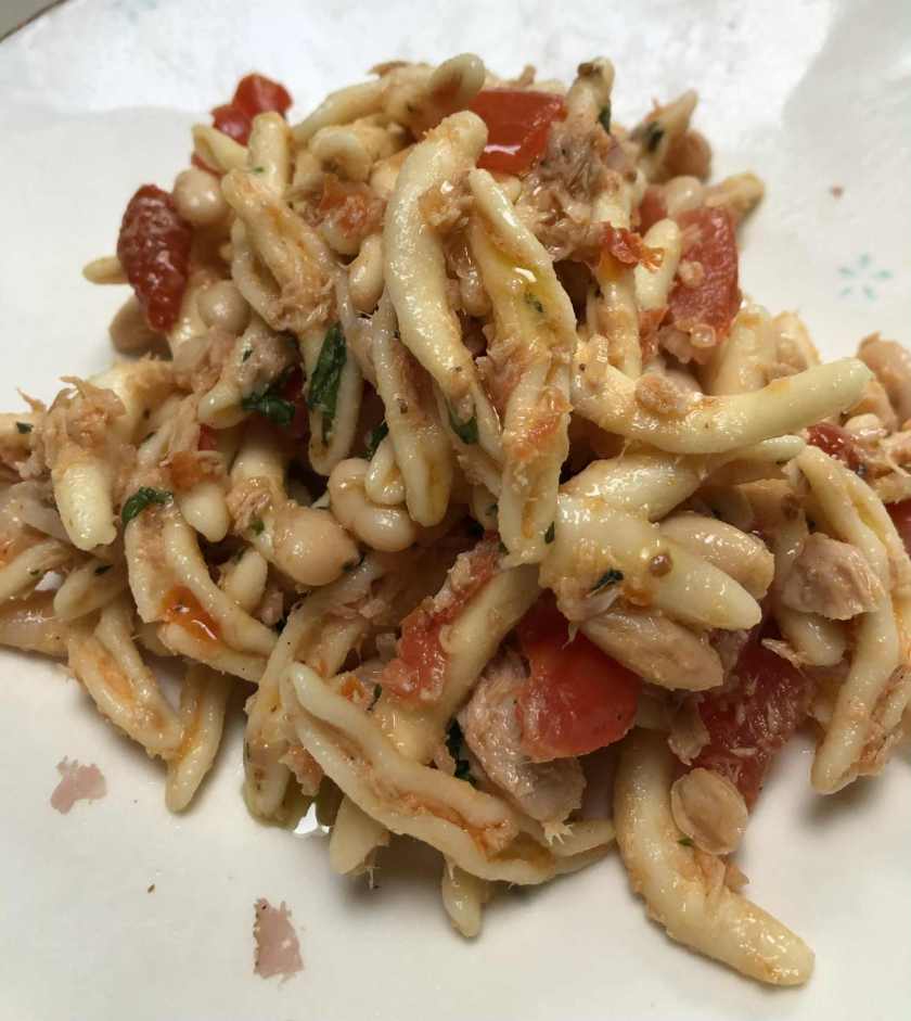 Salade de pâtes froides : capunti, haricots cannelini, tomates et thon dans une vinaigrette à l’huile d’olive, citron et tomates séchées au soleil