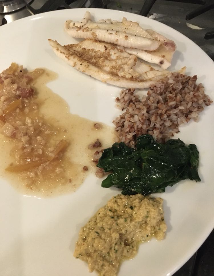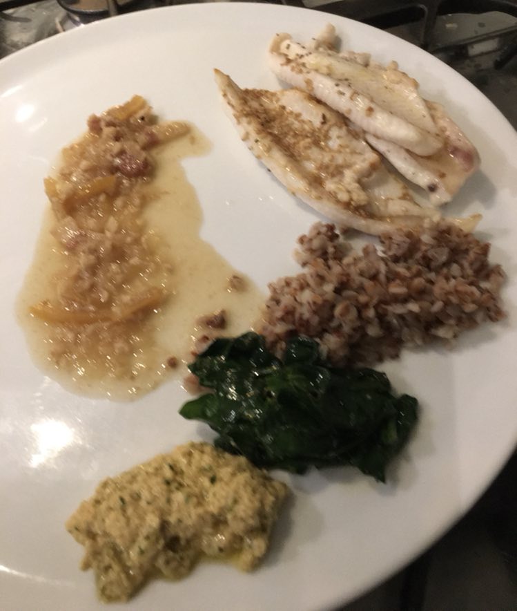 J’avais prévu de prélever le centre de chaque filet de turbot et de cuire minute en terminant au four, pendant ma cuisson des épinards. Mais je me suis donc retrouvé à devoir cuire 12 filets à la poêle, en deux fois, en gardant chaud la première partie pendant la cuisson de la deuxième, puis les deux pendant la cuisson des épinards. Et donc, résultat…. des filets surcuits. Ca à gâché le plat car le reste était excellent.