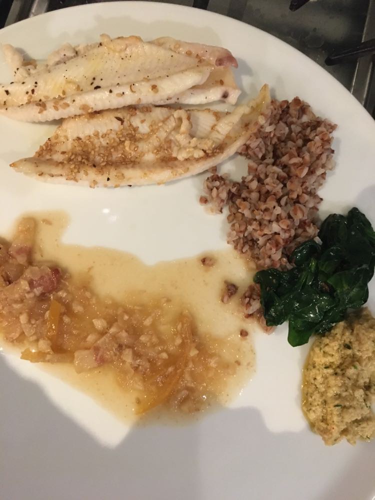 NOUVEL AN 2023 : FILET DE TURBOT, GOMASIO, HOUMOUS, KASHA, TOMBEE D’EPINARDS ET LE JUS AU CITRON CONFIT ET GUANCIALE TRAITE COMME UN JUS DE VIANDE