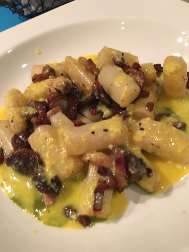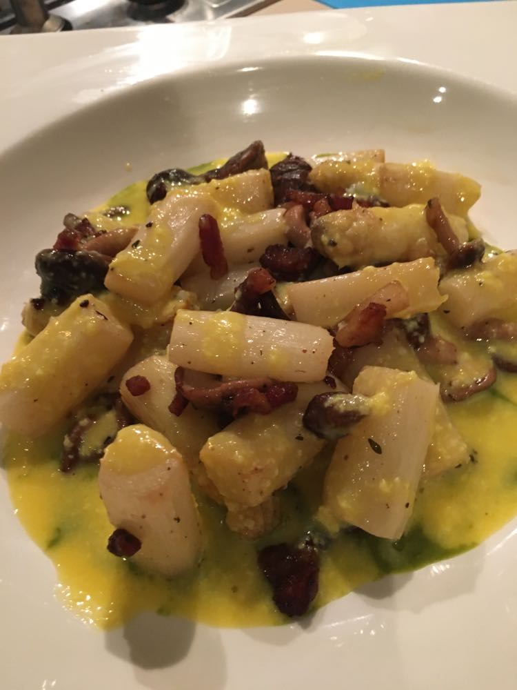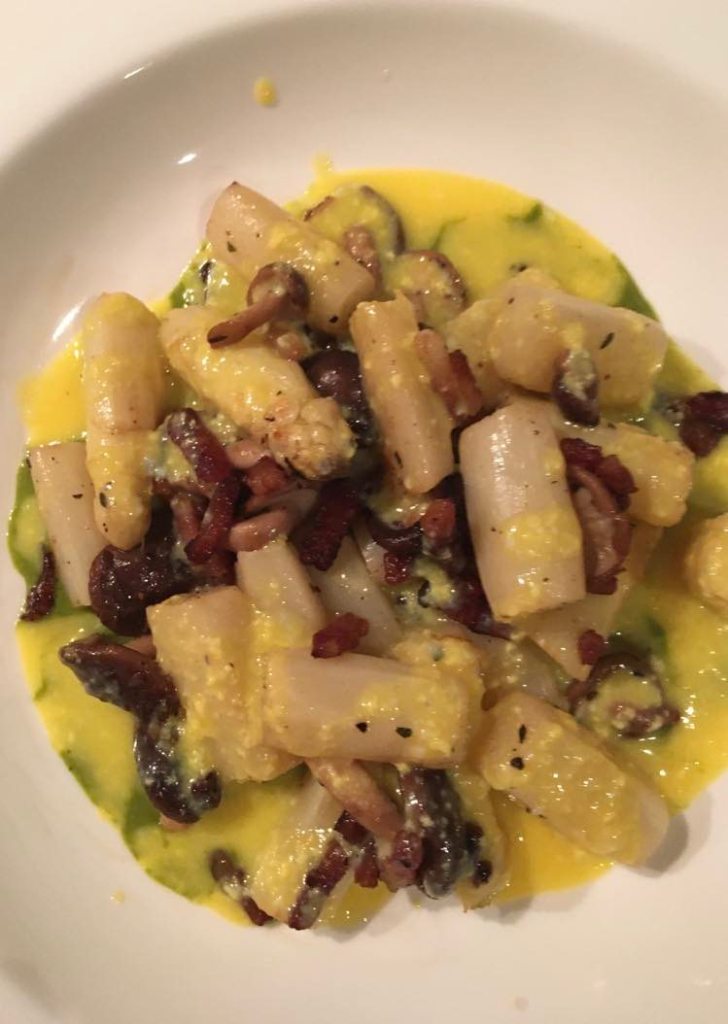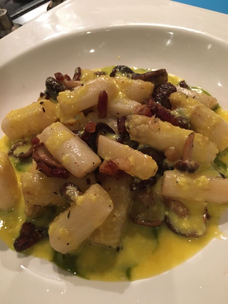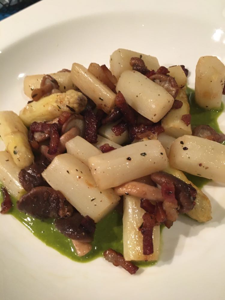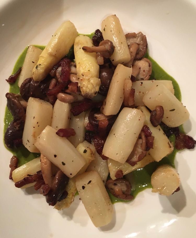 ASPERGES BLANCHES, CREME DE POURPIER, LARDO BIANCO CROUSTILLANT, SHIITAKE ET OEUF